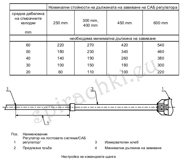 трябва да се изберат така, че САБ регулаторът да може да изравни евентуалното остатъчно износване на спирачните калодки. За целта при типовете DRV и SZ трябва да са налични следните минимални дължини на завиване (вижте маркировката върху САБ регулатора):